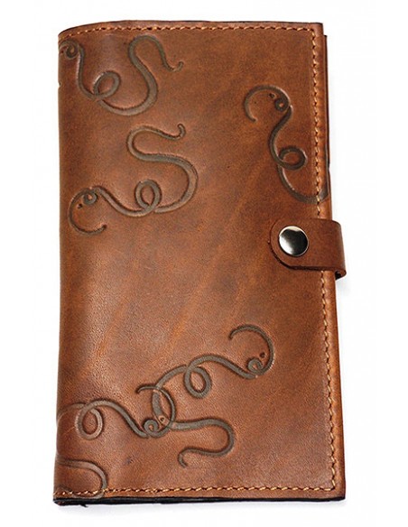 Rustic-style wallet made of thick oiled leather with six compartments for cards and a wallet inside.