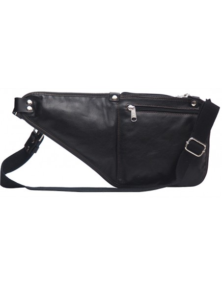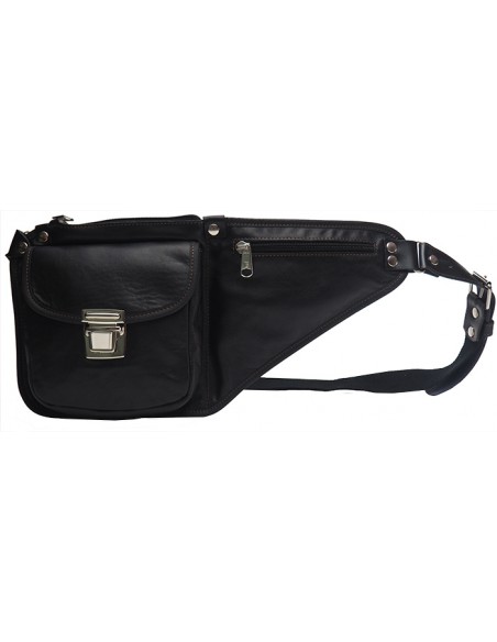 Riñonera de piel unisex que consta de 4 compartimentos, tres de ellos cerrados con cremalleras y el principal con un cierre rápido.