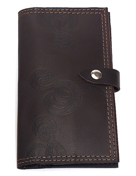 Portefeuille de style rustique en cuir épais huilé avec six compartiments pour cartes et un portefeuille à l'intérieur.